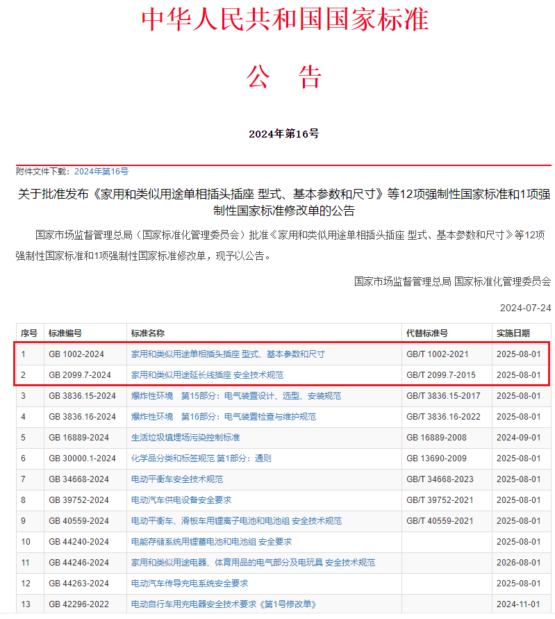 近日,國家標準GB 1002-2024《家用和類似用途單相插頭插座 型式、基本參數和尺寸》、GB 2099.7-2024《家用和類似用途延長線插座 安全技術規范》正式發布,推薦性國家標準轉為強制性國家標準,插頭插座安全強制升級,將于2025年8月1日實施!