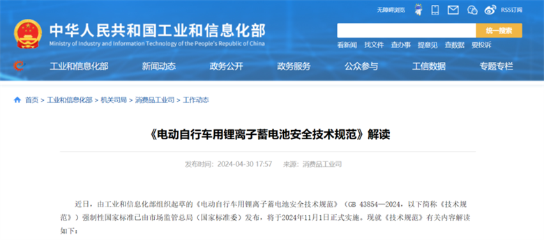 近日,市場監管總局(國家標準委)發布GB 43854—2024《電動自行車用鋰離子蓄電池安全技術規范》(以下簡稱《技術規范》)強制性國家標準,該標準由工業和信息化部歸口,將于2024年11月1日正式實施。