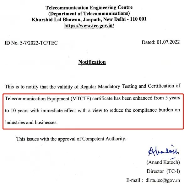 2022年7月1日,印度TEC發(fā)布通知,將常規(guī) (TEC)MTCTE 證書的有效期從5年延長到至10 年。生效日期:自通知發(fā)布日期起立即生效。