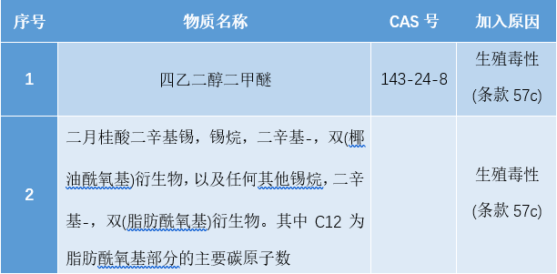 2020年9月1日,歐洲化學品管理局(ECHA)就2種潛在的高度關注物質(SVHCs)展開公眾評議。此次評議的兩種物質分別是四乙二醇二甲醚和二月桂酸二辛基錫,錫烷,二辛基-,雙(椰油酰氧基)衍生物,以及任何其他錫烷,二辛基-,雙(脂肪酰氧基)衍生物,其中C12為脂肪酰氧基部分的主要碳原子數。公眾評議將于2020年10月16日結束,在此期間各利益相關方均可向ECHA提交評議意見。通過評議的物質將作為第24批物質列入SVHC候選清單。