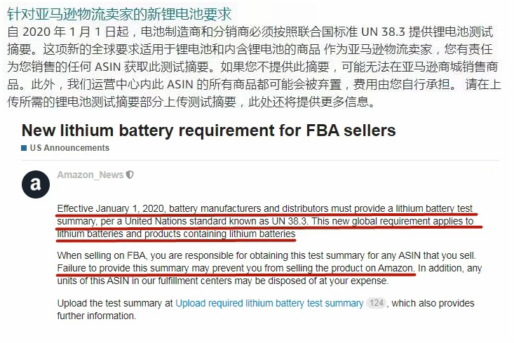 近日,各亞馬遜電商陸續(xù)收到了官方通知,要求自2020年1月1日起,電池制造商和經(jīng)銷商必須根據(jù)聯(lián)合國(guó)標(biāo)準(zhǔn)UN38.3提供鋰電池測(cè)試摘要,這一新的全球要求適用于所有的鋰電池和含鋰電池的產(chǎn)品。 該規(guī)定雖然是亞馬遜對(duì)FBA配送的賣家發(fā)出的通知,但根據(jù)該規(guī)定,所有出售鋰電池及包含鋰電池產(chǎn)品的賣家都必須按照UN38.3標(biāo)準(zhǔn),提供相應(yīng)的檢測(cè)摘要,并不僅僅只是使用亞馬遜FBA配送的賣家,也不僅僅只是亞馬遜賣家,而是全球出售鋰電池及包含鋰電池產(chǎn)品的所有賣家!